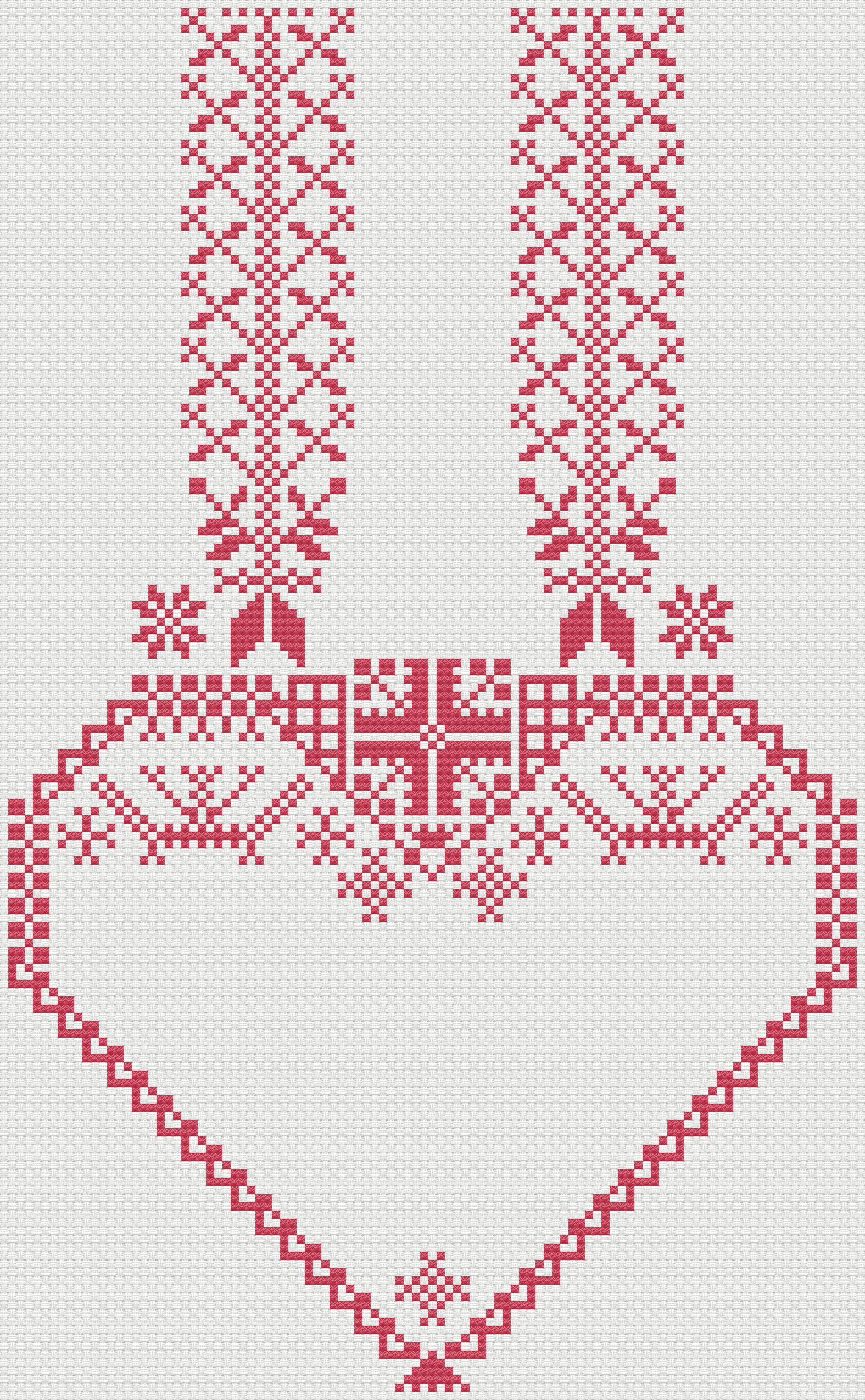 Det är tyvärr inte en exakt reproduktion då jag inte kunde tolka hela texten i originalet. Originalet är broderat på linne och stygnen är ojämna; här har jag omvandlat det till räknade korsstygn så att fler kan ta del av mönstret.